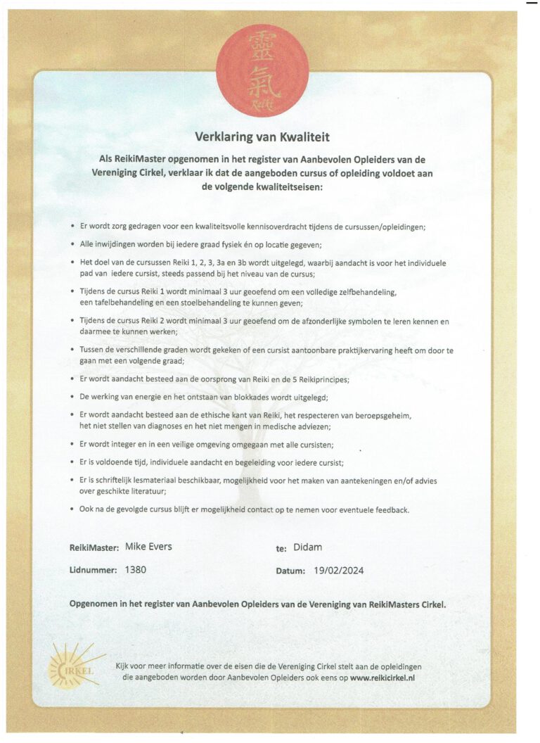 Wij zijn bij de Reiki Cirkel aangesloten als aanbevolen Reiki opleider, dit houd in dat u ervanuit kunt gaan dat wij aan bepaalde eisen moeten voldoen. Zodat u ervanuit kunt gaan dat onze Reiki cursussen aan kwaliteit voldoen.
